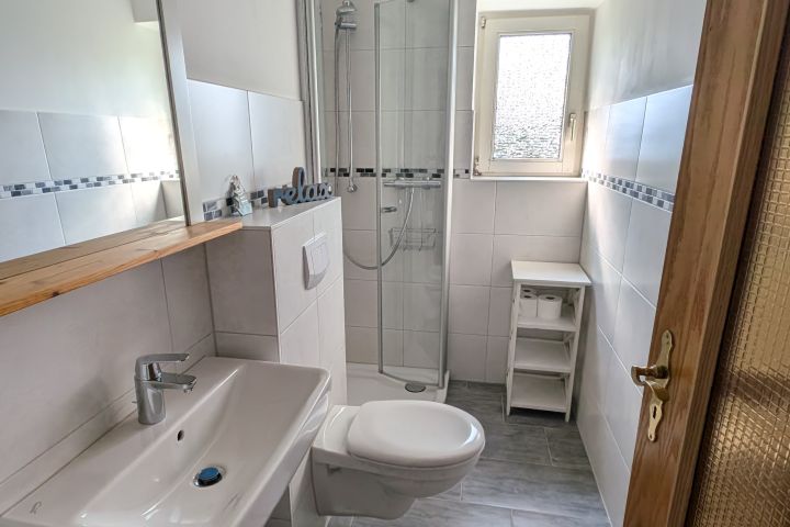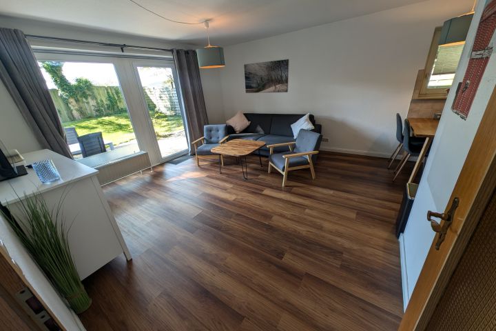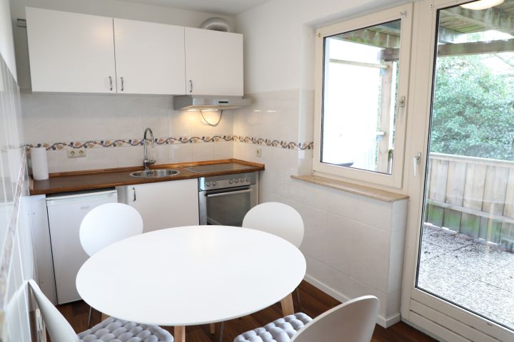 Komplett eingerichtet mit allem was man so braucht, außerdem Naturholzmöbel, Duschbad und Terrasse.