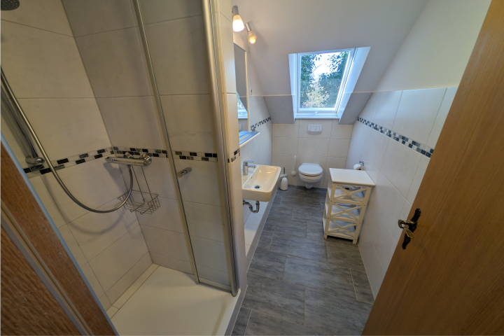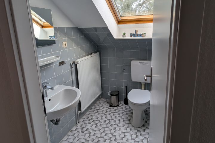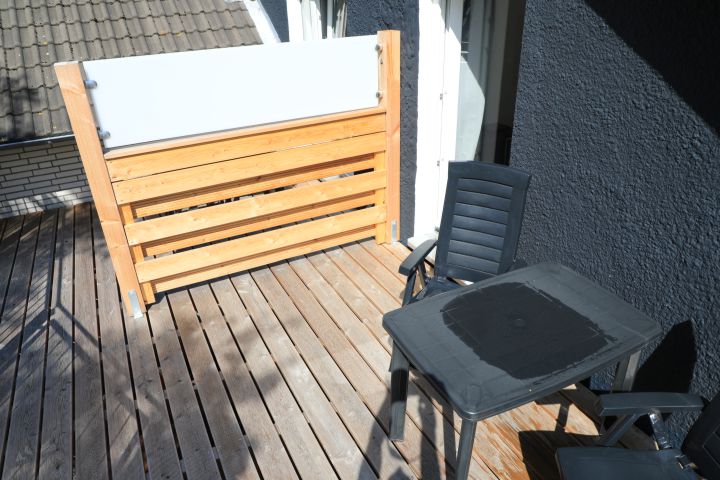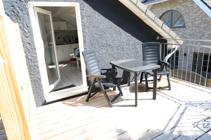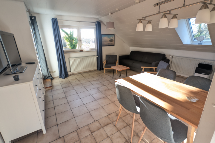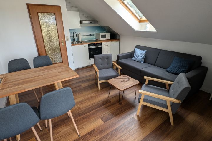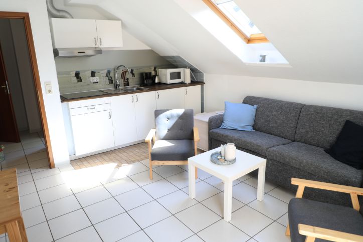 Komplett eingerichtet mit allem was man so braucht, außerdem Naturholzmöbel, Veluxfenster, Duschbad und Balkon.