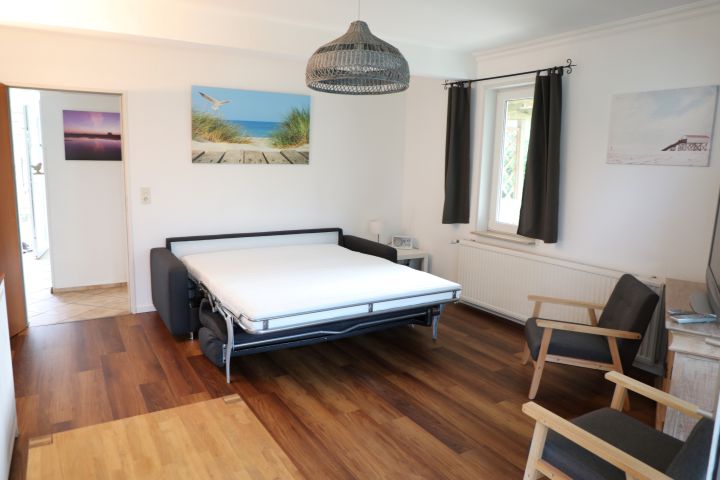 1 modernes Zimmer, helle Wohnung mit Rattanmöbeln, Schlafcouch 1,60 m breit, Küchenzeile und hellen Fliesen in der ganzen Wohnung.